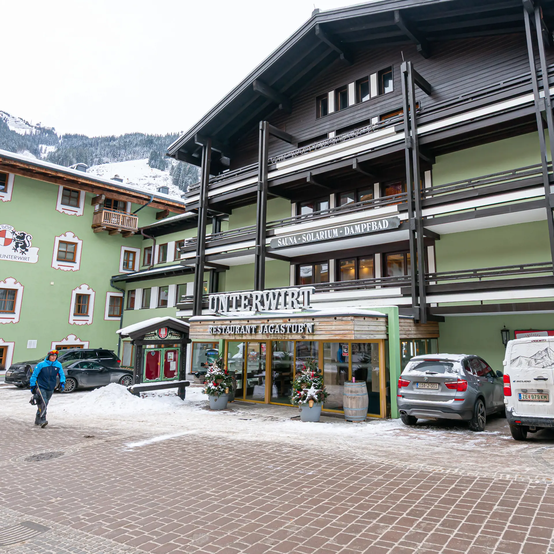 Omgivelserne er klassisk østrigske med lederhosen, træinventarer og store ølglas, men samtidig serverer de mad i høj kvalitet. Det er især mændenes toiletter på tredje sal, der vækker begejstring, da der er vinduer ved pissoiret, så du kan kigge ud over alperne, mens du tisser – og omvendt kan folk vinke ind fra liften.